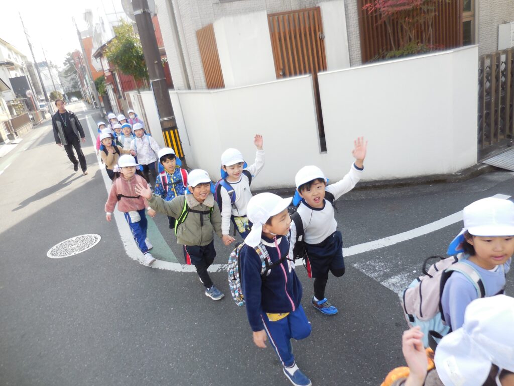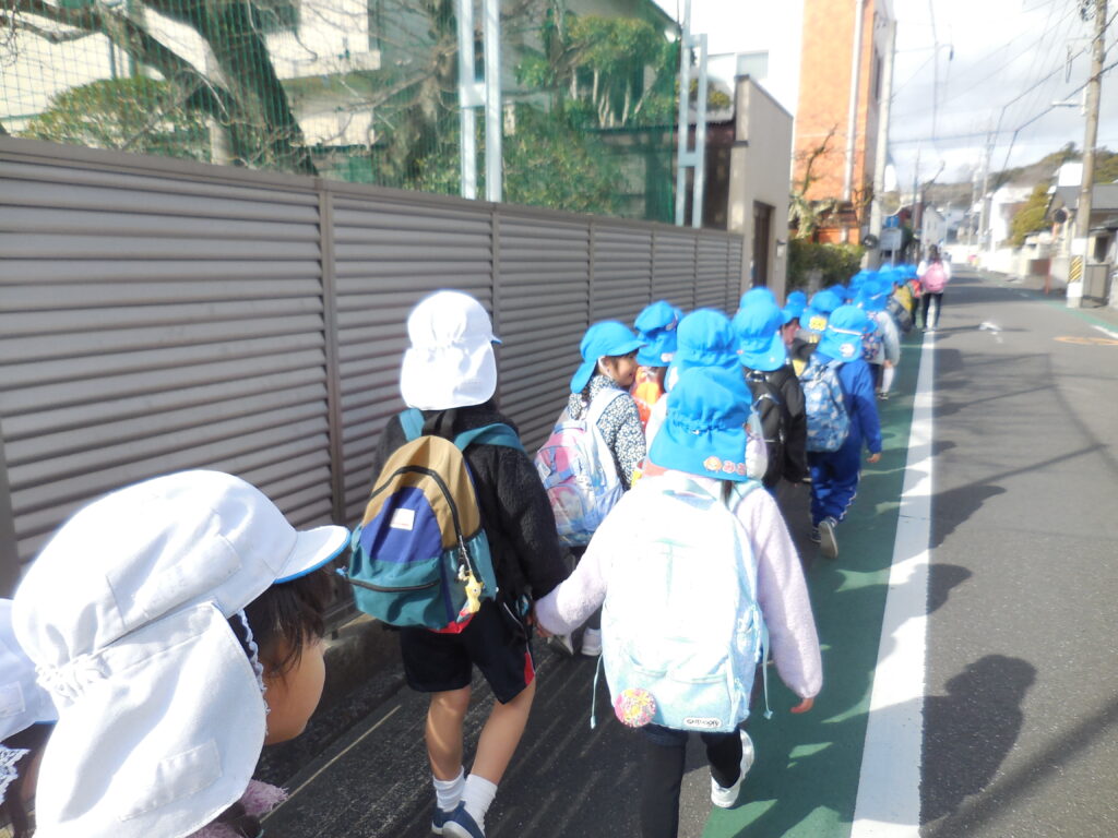 登園してすぐ、おやつ(お菓子)の話題で盛り上がる子どもたち。元気に幼稚園を出発しました。