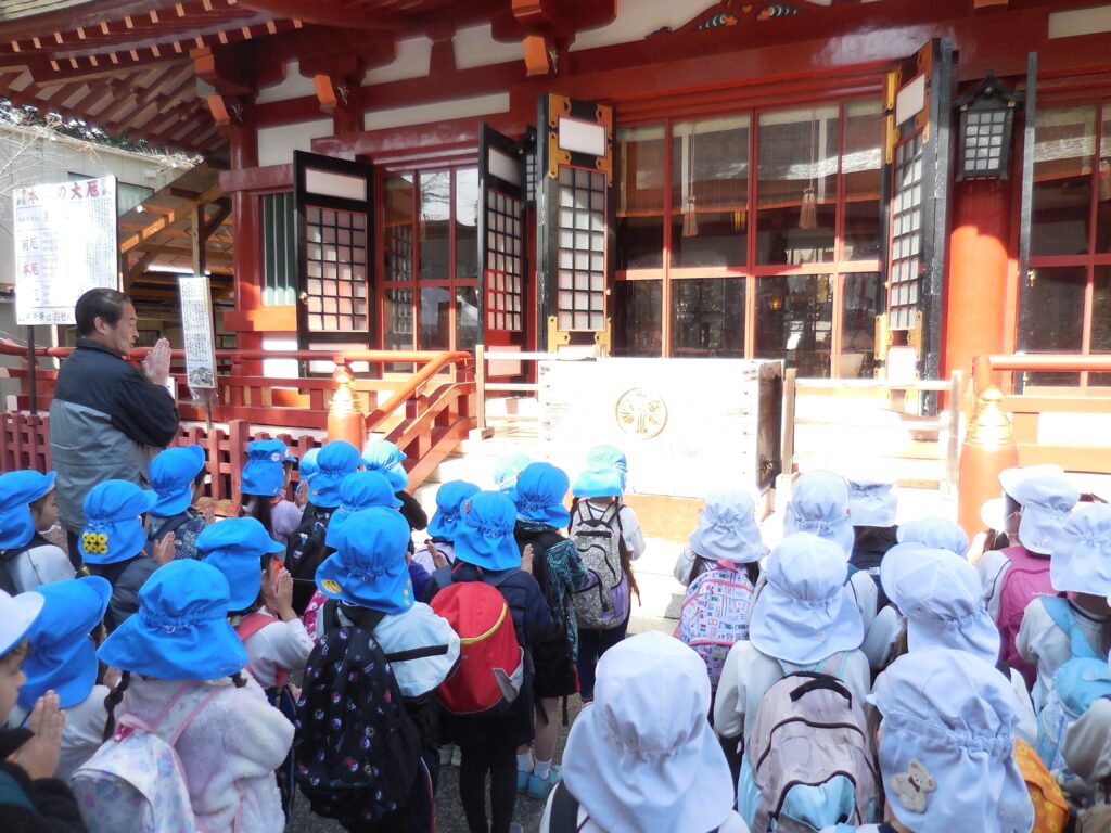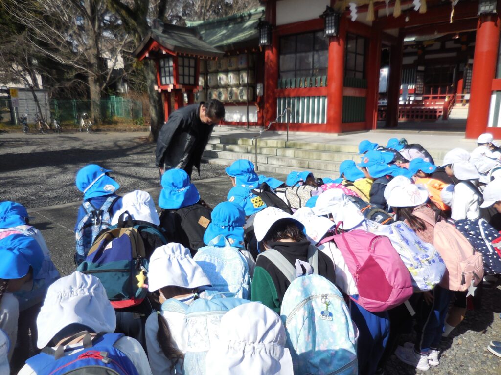 神社に到着し、園長先生から正しいお参りの仕方を教えていただき、皆でお願い事をしました。