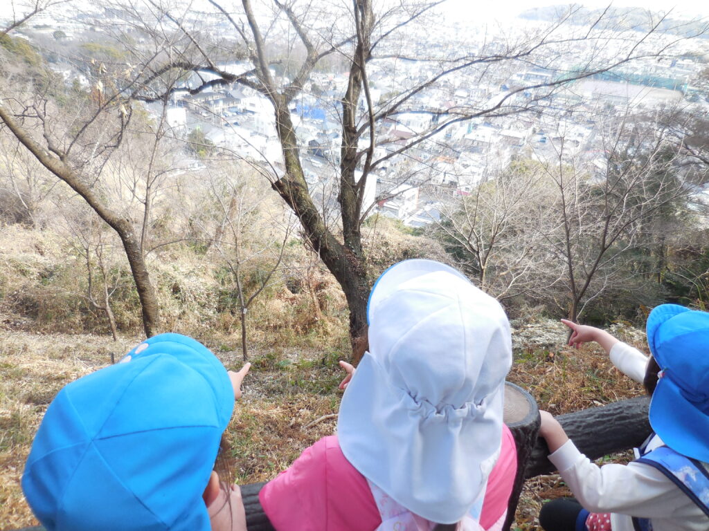 頂上に到着すると、城北公園まで同じく遠足に出かけている年少さんの姿が見えました!!